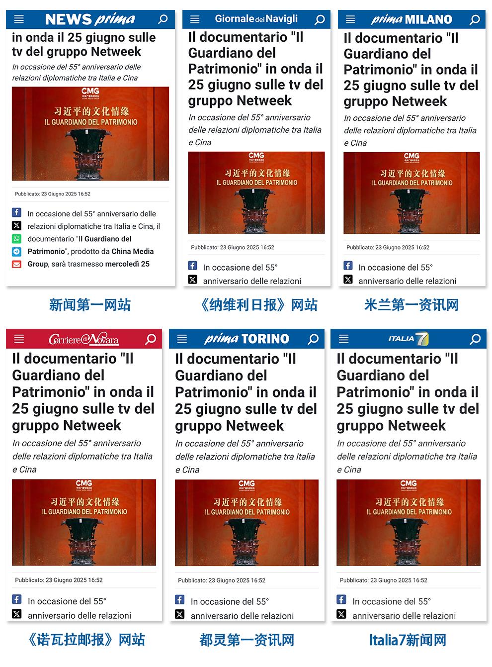 在中意建交55周年之際,由中央廣播電視總臺(tái)制作的專題片《習(xí)近平的文化情緣》,當(dāng)?shù)貢r(shí)間6月25日起在意大利阿爾瑪電視臺(tái)、拉齊奧電視臺(tái)、《米蘭財(cái)經(jīng)報(bào)》網(wǎng)站等主流媒體平臺(tái)上線播出。意大利新聞第一網(wǎng)站、《納維利日?qǐng)?bào)》網(wǎng)站、米蘭第一資訊網(wǎng)等40多家主流媒體對(duì)節(jié)目播出進(jìn)行預(yù)告,受到意各界廣泛關(guān)注。