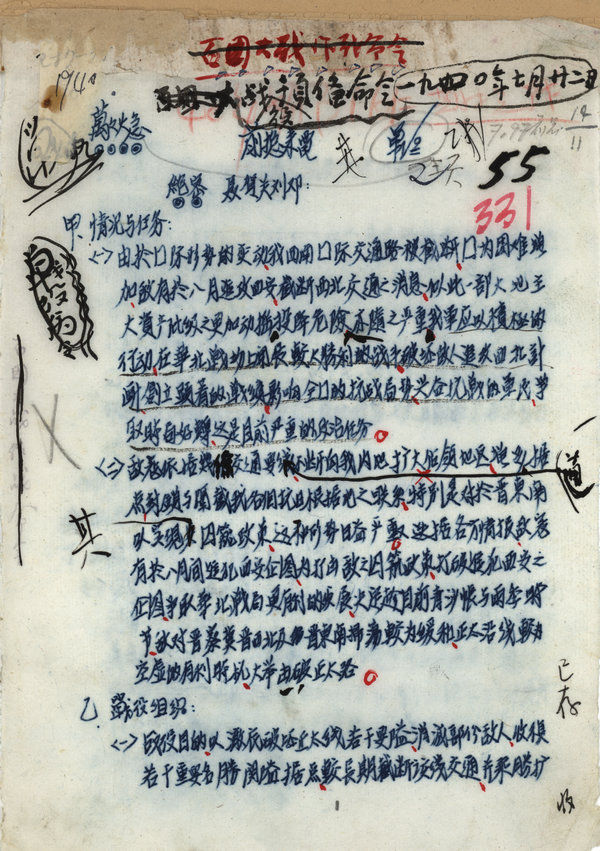 為粉碎侵華日軍的“囚籠政策”、遏制國(guó)民黨頑固派的妥協(xié)投降逆流,1940年8月至翌年1月,中國(guó)共產(chǎn)黨領(lǐng)導(dǎo)的八路軍在華北發(fā)動(dòng)了百團(tuán)大戰(zhàn)。百團(tuán)大戰(zhàn)第一階段以破襲正太鐵路為重點(diǎn),這是1940年7月22日簽發(fā)的破襲正太路戰(zhàn)役預(yù)備命令(中央檔案館提供)。
