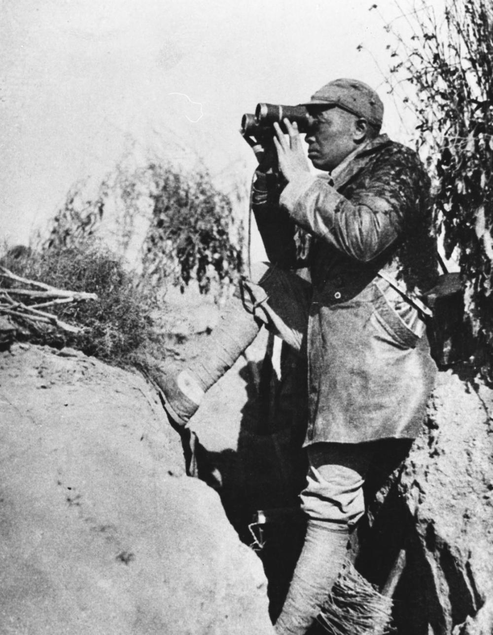 百團(tuán)大戰(zhàn),是抗日戰(zhàn)爭(zhēng)中八路軍在華北地區(qū)發(fā)動(dòng)的一次規(guī)模最大、持續(xù)時(shí)間最長(zhǎng)的進(jìn)攻戰(zhàn)役,先后有105個(gè)團(tuán)約20余萬(wàn)人參加,僅前3個(gè)半月,就作戰(zhàn)1824次,斃傷日、偽軍2.58萬(wàn)人,俘虜1.8萬(wàn)余人。這是彭德懷身處前線指揮百團(tuán)大戰(zhàn)(中國(guó)照片檔案館館藏)。