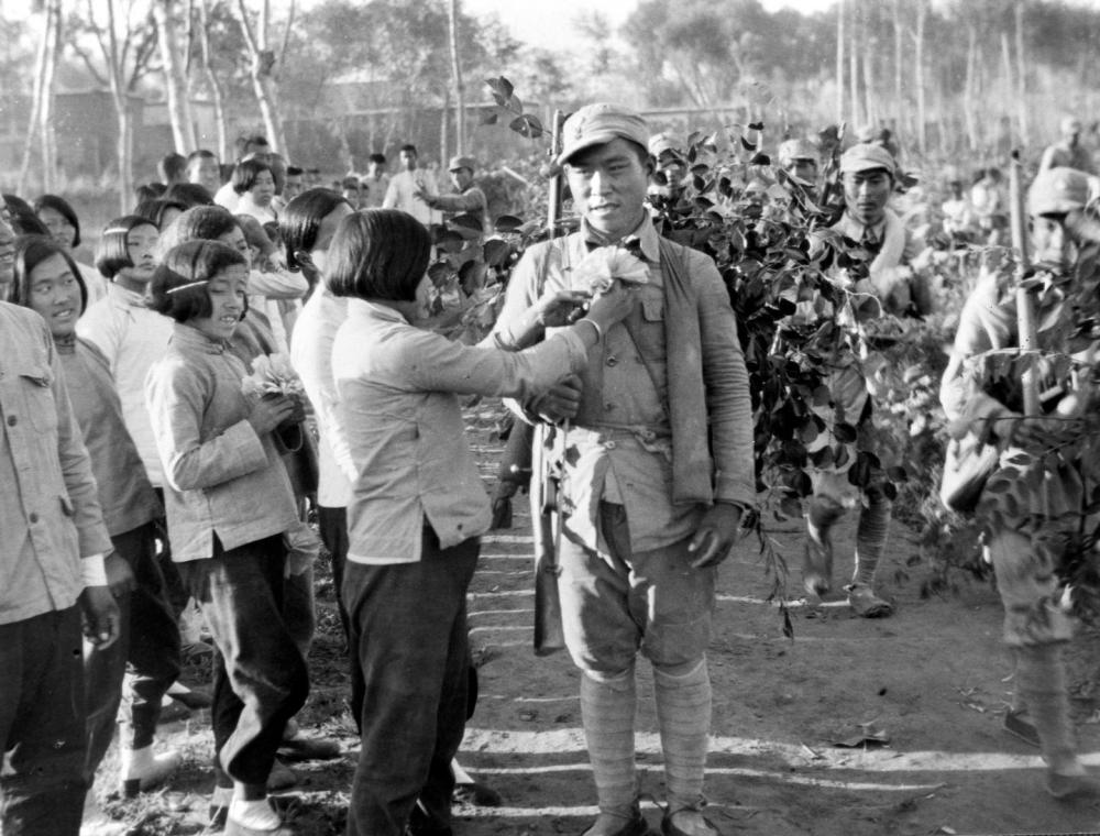 這是老百姓為百團(tuán)大戰(zhàn)勝利歸來的英雄佩戴光榮花(中國(guó)照片檔案館館藏)。