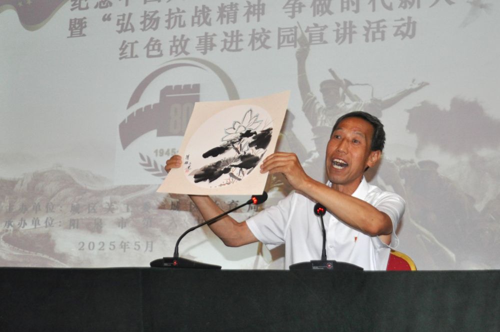 出生在陽(yáng)泉市正太鐵路破襲戰(zhàn)沿線區(qū)域的姚永田,從小聽抗戰(zhàn)故事長(zhǎng)大。他利用課余時(shí)間研究家鄉(xiāng)抗戰(zhàn)史、編寫校本教材,并在校園義務(wù)宣講紅色故事100余場(chǎng),努力讓紅色精神在年輕一代心中生根發(fā)芽。這是2025年5月26日,姚永田在陽(yáng)泉市第六中學(xué)為學(xué)生們宣講。