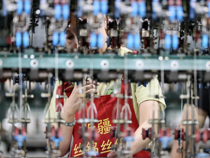 2025年7月29日,工人在新疆絲錦絲綢紡織有限公司生產(chǎn)車間內(nèi)的自動繅絲機(jī)上作業(yè)。近年來,新疆塔城地區(qū)烏蘇市引進(jìn)桑蠶繭絲綢智能化全產(chǎn)業(yè)鏈項(xiàng)目,鼓勵農(nóng)民種桑養(yǎng)蠶,拓寬興邊富民新“絲”路。