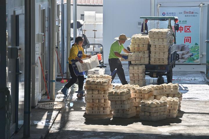 2024年10月31日,村民在廣西百色市德保縣那造村食用菌生產(chǎn)基地搬運(yùn)采摘的蘑菇。那造村通過做優(yōu)特色產(chǎn)業(yè)、豐富村民生活、完善基礎(chǔ)設(shè)施等多項(xiàng)具體舉措,推動各項(xiàng)事業(yè)快速發(fā)展。