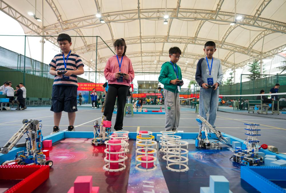 5月31日,四名參賽選手在全國青少年科技教育成果展示大賽云南省區(qū)域賽上操作機器人進行比賽。新華社記者 陳欣波 攝