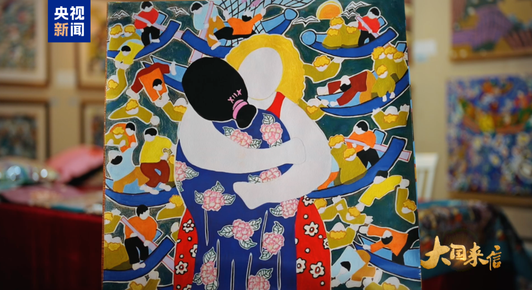 吳小飛也回贈(zèng)了一件禮物。由于她是一名漁民畫創(chuàng)作者,于是就把一幅名為《擁抱》的作品創(chuàng)作出來送給了對(duì)方。在她看來,這不但是她們兩個(gè)人的擁抱,也是國(guó)和國(guó)的擁抱。