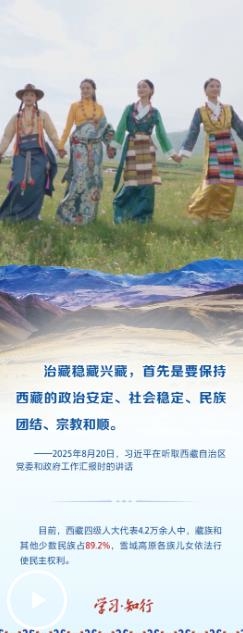 2025年8月20日,習(xí)近平總書記率中央代表團(tuán)乘專機(jī)抵達(dá)拉薩,出席西藏自治區(qū)成立60周年慶?;顒?dòng)。在聽取西藏自治區(qū)黨委和政府工作匯報(bào)時(shí),習(xí)近平總書記強(qiáng)調(diào),“持續(xù)深入抓好穩(wěn)定、發(fā)展、生態(tài)、強(qiáng)邊四件大事,努力建設(shè)團(tuán)結(jié)富裕文明和諧美麗的社會(huì)主義現(xiàn)代化新西藏”。