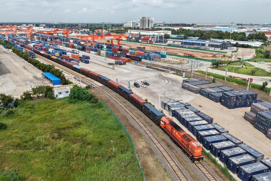 8月27日,一列貨運(yùn)列車駛?cè)胛挥谏虾鲜痉秴^(qū)內(nèi)的中國-上海合作組織地方經(jīng)貿(mào)合作示范區(qū)多式聯(lián)運(yùn)中心(無人機(jī)照片)。新華社記者李紫恒攝