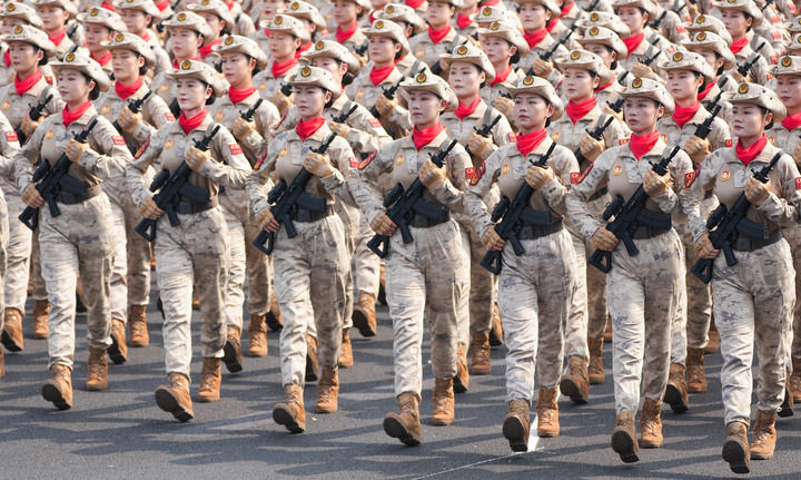 9月3日,天安門廣場(chǎng)。身著蛙式作訓(xùn)服、手握鋼槍的女民兵,身姿挺拔、英姿颯爽。她們來自當(dāng)年的主要抗日根據(jù)地。這是民兵首次亮相以紀(jì)念抗戰(zhàn)為主題的閱兵活動(dòng)。