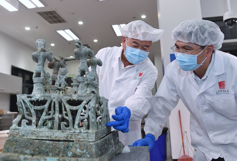 2023年5月30日,在四川三星堆博物館文物保護和修復中心,文物修復師郭漢中(左)與同事討論神壇底座修復方案。郭漢中從事文物修復工作已40余年,深度參與了三星堆祭祀坑的發(fā)掘工作,累計修復文物6000余件。“大概還有上萬件文物等著修復,需要一代接著一代往下干?!惫鶟h中說,他要把平生所學傳承下去,培養(yǎng)更多人才。