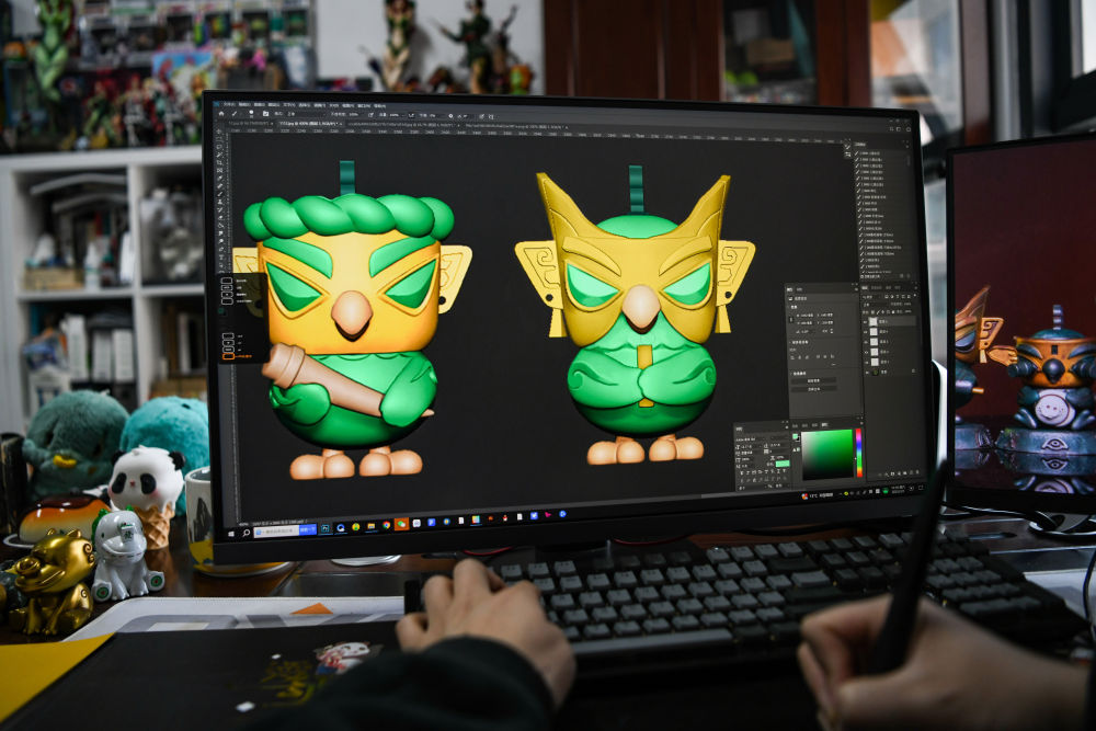2025年3月1日,文創(chuàng)產(chǎn)品策劃運營師曾舟在位于四川成都的辦公室內(nèi)完善文創(chuàng)產(chǎn)品細節(jié)。他以三星堆青銅神樹、青銅縱目面具、青銅獸面等文物為創(chuàng)作藍本,結(jié)合潮玩元素設計的文創(chuàng)作品廣受歡迎?!拔蚁胱龅牟皇峭婢呖煜罚怯袃?nèi)容、有溫度、有意義的文化IP,讓年輕一代隨手摸到沉淀千年的文化。”曾舟說。
