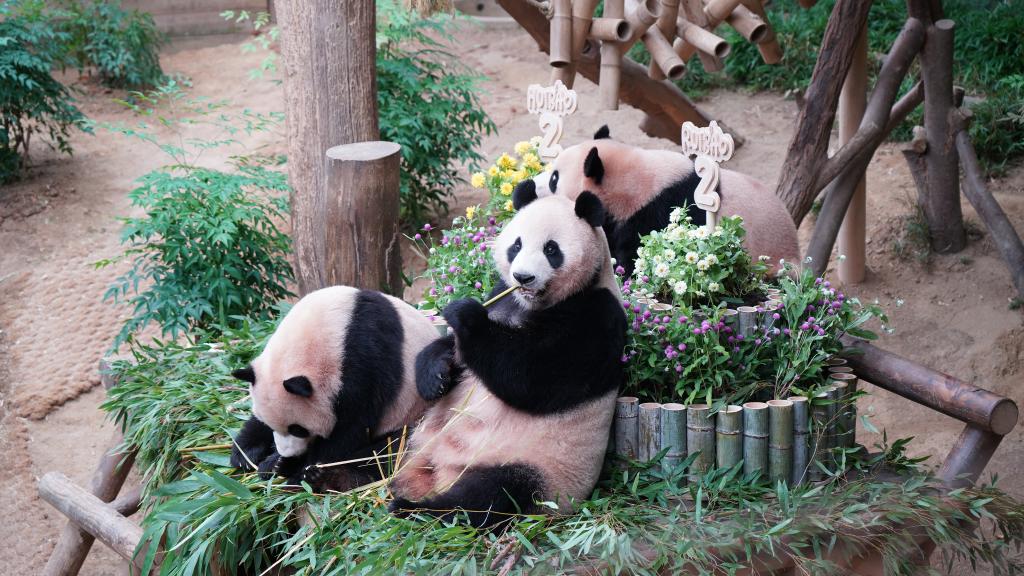 2025年7月7日,在韓國(guó)京畿道龍仁市愛寶樂(lè)園,大熊貓媽媽“愛寶”(中)和“睿寶”、“輝寶”在慶生活動(dòng)上享用美食。新華社發(fā)(孫一然攝)