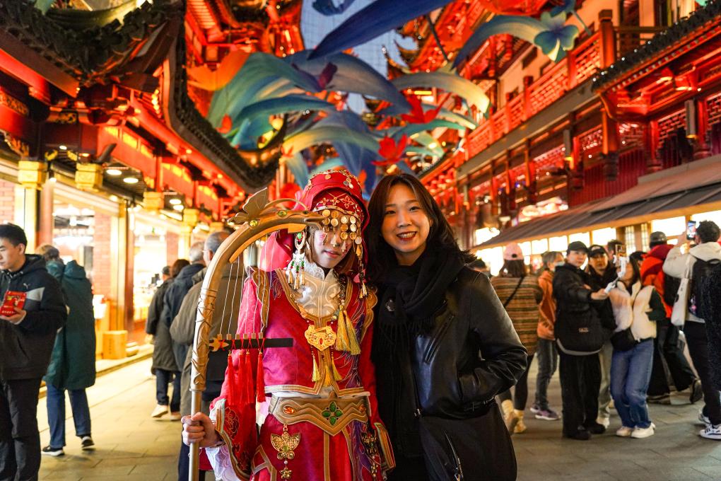 2024年11月30日,來(lái)自韓國(guó)的游客(右)在上海豫園商城與游戲角色裝扮者合影。新華社發(fā)(謝鑫攝)