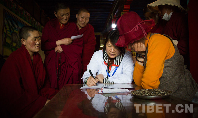 2019年5月,“同心·共鑄中國(guó)心” 醫(yī)療志愿者在拉薩市羊八井鎮(zhèn)的嘎洛寺,為寺內(nèi)尼眾進(jìn)行義診。攝影:趙耀