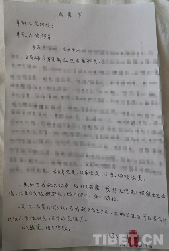 住院期間,索南吉的身份就是病人,對(duì)這個(gè)未知的疾病難免害怕,好的和不好的結(jié)局,她都反復(fù)想到了。作為一名參加過2003年非典和2010年甘肅舟曲特大泥石流一線救治工作的醫(yī)務(wù)工作者、有13年黨齡的共產(chǎn)黨員,她在住院的第2天,便向護(hù)士借來了筆和紙,在床頭向醫(yī)院鄭重寫下了請(qǐng)?jiān)笗骸耙皇侨绻遗浜现委?,?zhàn)勝了病魔,我將無償捐獻(xiàn)自己(的)血清,供醫(yī)療實(shí)驗(yàn)研究。二是萬一病魔打倒了我,我將獻(xiàn)出自己身體,供相關(guān)醫(yī)療單位(開展)具有針對(duì)性的實(shí)驗(yàn)研究,盡早攻克(新冠肺炎治療的)難關(guān)。”