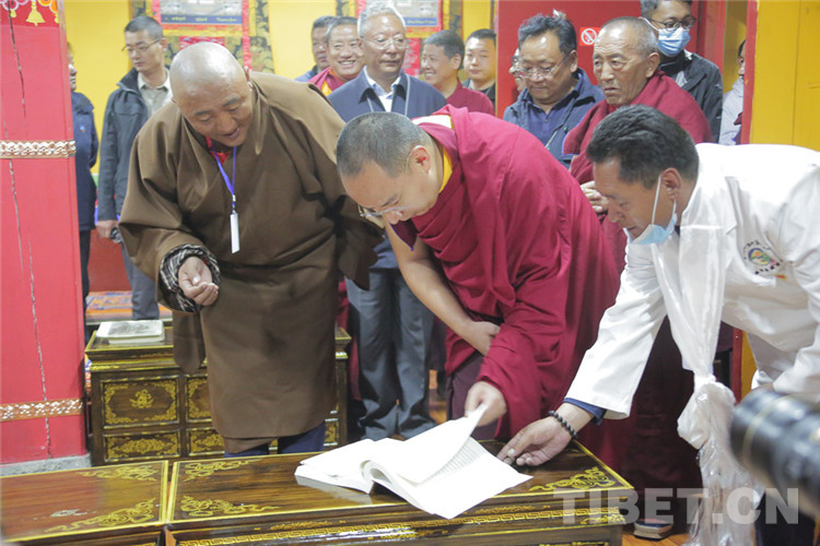 醫(yī)藥的發(fā)展關(guān)鍵是人才,十一世班禪首先來到了博物館內(nèi)的專家門診室和學(xué)術(shù)講座廳。在學(xué)術(shù)講座廳內(nèi),十一世班禪俯身拿起桌上學(xué)員的筆記認(rèn)真地翻閱。隨后,十一世班禪進(jìn)入藥材廳、藏醫(yī)器械展廳、藥材標(biāo)本室、羌塘名醫(yī)傳承介紹廳、藏醫(yī)古跡醫(yī)典廳、醫(yī)算唐卡廳、天文歷算廳等進(jìn)行了參觀調(diào)研。嘉黎縣藏醫(yī)院專家向十一世班禪詳細(xì)介紹了嘉黎縣藏醫(yī)藥歷史文化博物館建館情況及展示的各類文物級珍貴展品。