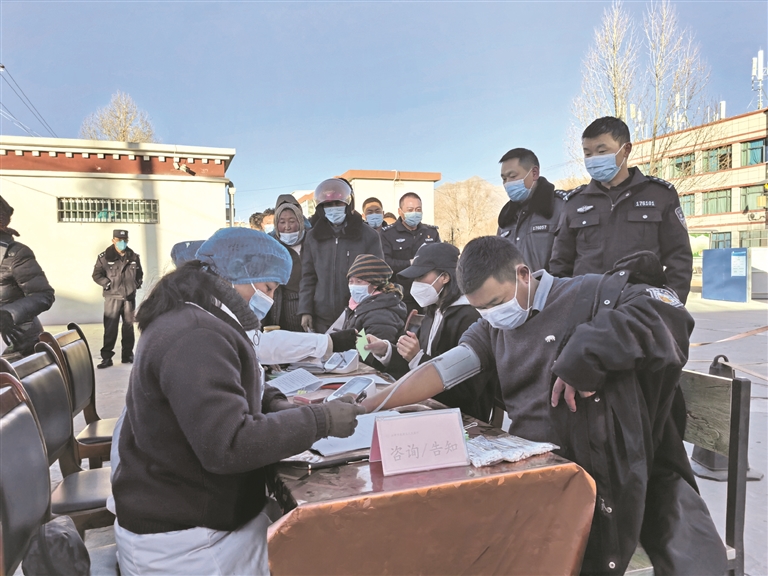 自2021年1月1日起,拉薩市在各縣(區(qū))設(shè)置26個(gè)新冠疫苗接種點(diǎn),按照知情同意、自愿接種的原則,優(yōu)先對(duì)重點(diǎn)人群進(jìn)行疫苗接種工作。圖為1日上午,在達(dá)孜區(qū)人民醫(yī)院,醫(yī)護(hù)人員正在對(duì)公安干警及群眾進(jìn)行血壓檢測和詢問既往病史等,并與他們簽訂新冠病毒疫苗接種同意書。拉薩融媒記者 范江英攝