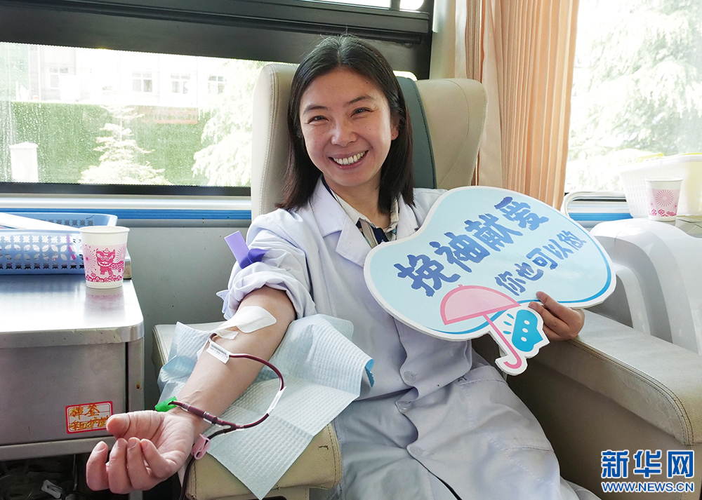 5月27日,來自北京協(xié)和醫(yī)院的援藏專家楊筱在獻血。(新華網 旦增努布攝)