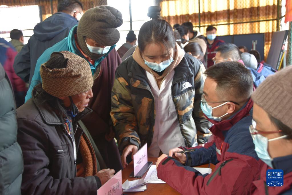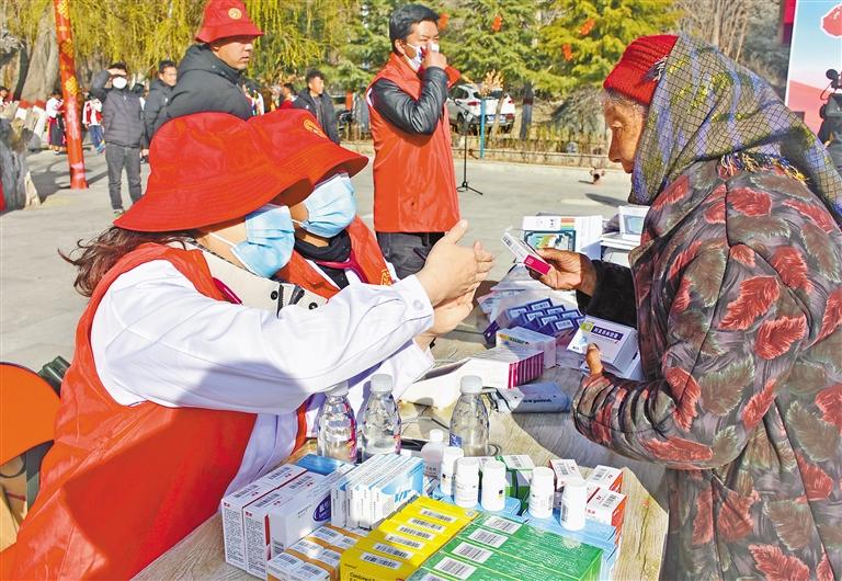 圖為自治區(qū)衛(wèi)生健康系統(tǒng)的志愿者在瓊結(jié)縣為群眾贈(zèng)藥、解答健康問(wèn)題。記者 劉楓 攝