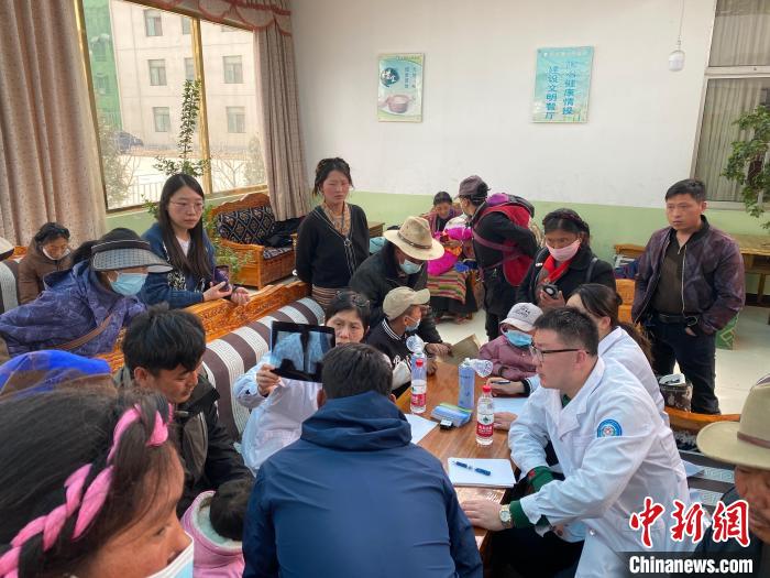 上海醫(yī)務(wù)人員在日喀則當(dāng)?shù)貫楹⒆觽兒Y查?!∩虾J袃和t(yī)院供圖