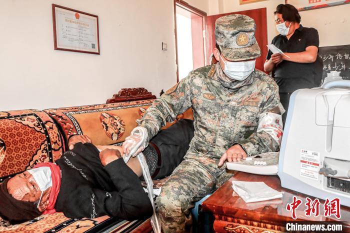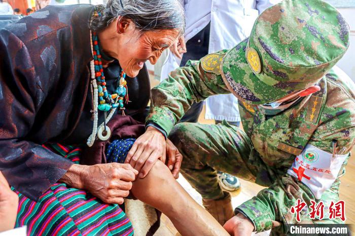 “能不能去家里給我阿媽檢查一下呢?”在巡診現(xiàn)場(chǎng),醫(yī)療隊(duì)隊(duì)長(zhǎng)賀焱林得知70歲的藏族老阿媽格桑措姆,因身體原因無法到達(dá)現(xiàn)場(chǎng)就醫(yī)后,立即派出內(nèi)外科黃秋儒、馬善金2名經(jīng)驗(yàn)豐富的軍醫(yī)冒雨前往老人家中進(jìn)行救治。