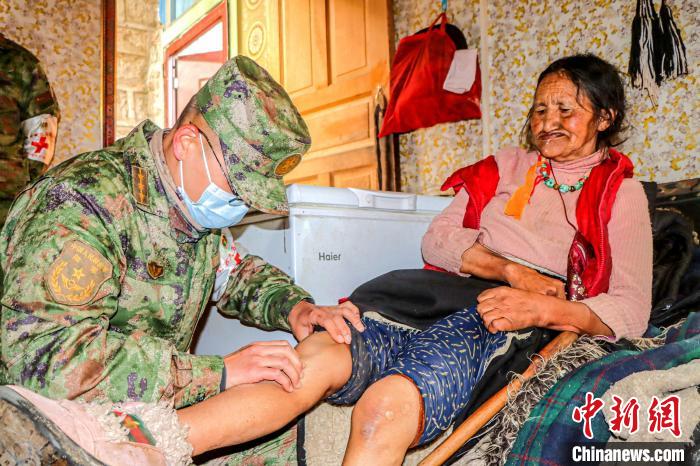 格桑措姆因膝蓋疼痛,已三四年不能行走。醫(yī)療隊(duì)軍醫(yī)抵達(dá)后,立即對(duì)老人進(jìn)行了初步篩查和救治。同時(shí),為了進(jìn)一步確診病因,還與她約定次日上門接她到醫(yī)院進(jìn)行X線檢查,并將把她安全送回家。