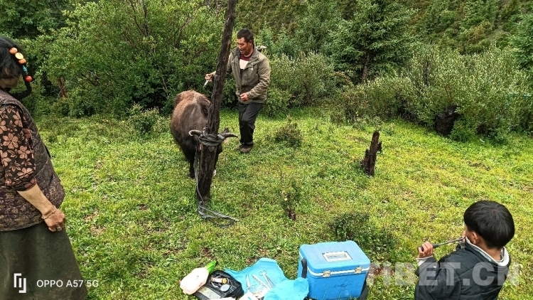 只見那頭受傷的牛被拴在木樁上,尾巴處還帶有一些血跡,顯得非常虛弱。索杰醫(yī)生先是把手術(shù)的傷口處仔細檢查了一遍,然后取來藥箱,在傷口處給藥,他告訴牧民家的男主人,?;謴?fù)得還可以,不要太擔(dān)心,留下的藥是這幾天涂抹和口服的,要按時服用。