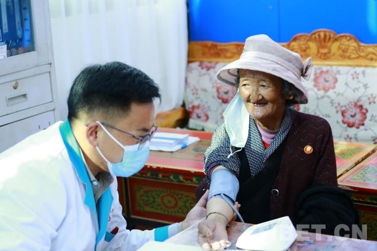 圖為亞東縣中心醫(yī)院醫(yī)護(hù)人員為老人測量血壓 圖源:帕里鎮(zhèn)四社區(qū)工作隊