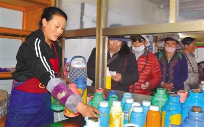 沖賽康“愛心飯館”位于拉薩老城區(qū)核心地帶,因“愛心飯館”飯菜量足、甜茶味道好,深受廣大居民群眾的喜愛。記者來到?jīng)_賽康“愛心飯館”時,飯館內(nèi)早已座無虛席,每個窗口前都排滿了人,廚房內(nèi)的工作人員更是忙得不可開交。“甜茶已經(jīng)賣完了,請稍等一會兒,我們馬上做?!狈?wù)員向客人說道。
