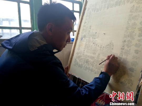 17日,古城拉薩八廓街一古建大院的一角,晉美和他的師兄盤腿而坐,專注著眼前的畫板,不時(shí)翻著手邊《四部醫(yī)典系列掛畫全集》的圖冊,藏醫(yī)藥典籍中的人體骨骼、脈絡(luò)在他們的筆下栩栩如生。