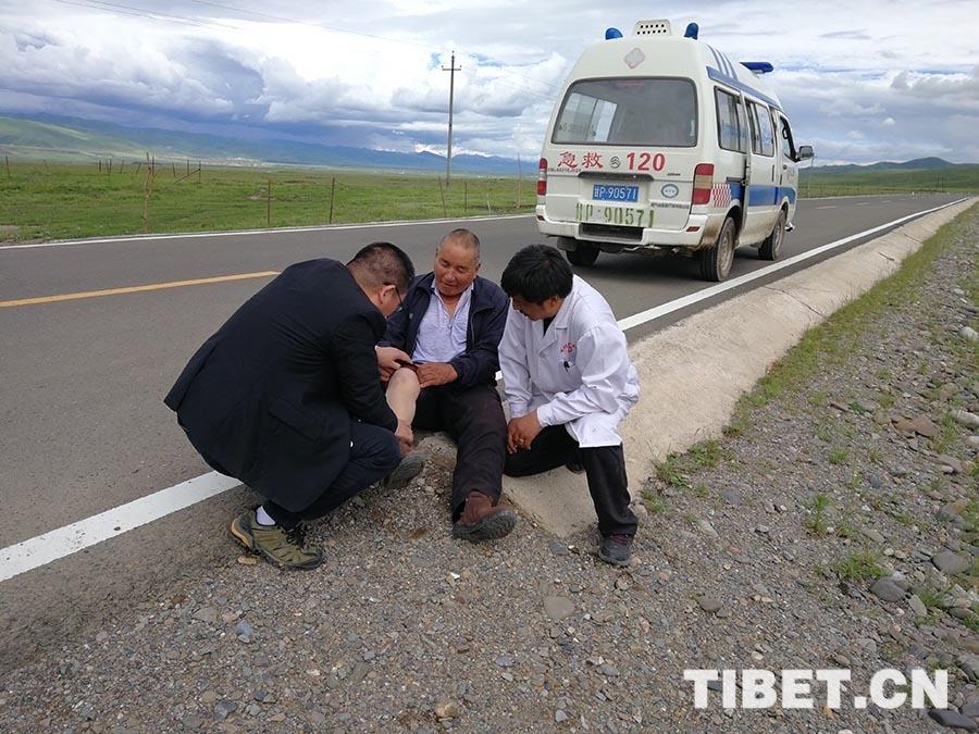 老人說自己的膝關(guān)節(jié)總是會疼,剛才在路邊站了一個多小時,腫脹疼痛更加嚴(yán)重??吹竭@種情況,來自北京市昌平區(qū)醫(yī)院的骨科主任王現(xiàn)海立即在公路邊開始診治。詢問病史及進(jìn)行體格檢查后,醫(yī)生診斷為右膝關(guān)節(jié)骨性關(guān)節(jié)炎。隨后與歐拉秀瑪鄉(xiāng)衛(wèi)生院院長楊河軍及其他專家一起將老人抬上救護(hù)車,讓他躺在救護(hù)車的擔(dān)架上,進(jìn)行了腰椎及髖關(guān)節(jié)的體檢,排除了腰椎及髖部疾患的可能。王現(xiàn)海輔導(dǎo)老人進(jìn)行針對膝關(guān)節(jié)骨性關(guān)節(jié)炎的康復(fù)鍛煉,建議其口服消炎止痛類藥物,并到上級醫(yī)院進(jìn)一步檢查明確病情。老人連忙稱謝。