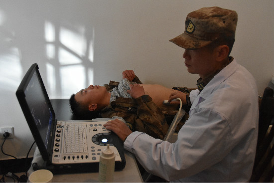 聽(tīng)說(shuō)陸軍九五六醫(yī)院前來(lái)巡診,官兵們?cè)缫训群蛟陂T外。查體、量血壓、做彩超……醫(yī)療隊(duì)員們耐心地詢問(wèn)官兵的身體狀況,為每個(gè)官兵做詳細(xì)的體檢。