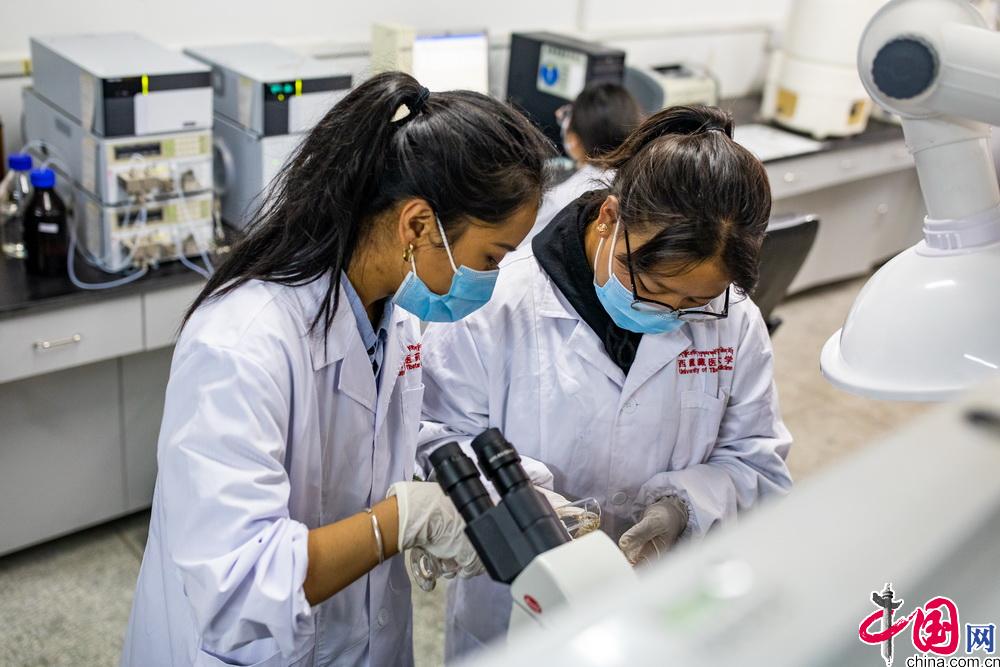 西藏藏醫(yī)藥大學目前擁有校內(nèi)實訓室24個、附屬醫(yī)院1家,校外藏藥采認藥實踐實訓基地2個、非直屬附屬醫(yī)院2家、教學醫(yī)院7家、實習醫(yī)院11家、教學藥廠2家、實習藥廠1家,同時還擁有國家中醫(yī)藥管理局藏醫(yī)藥繼續(xù)教育培訓基地、中醫(yī)藥優(yōu)勢特色教育(藏藥)培訓基地和中央與地方共建藏醫(yī)特色療法實踐基地等重要教學基地。圖為學校學生在實驗室中進行藥物試驗。中國網(wǎng)記者 鄭亮攝