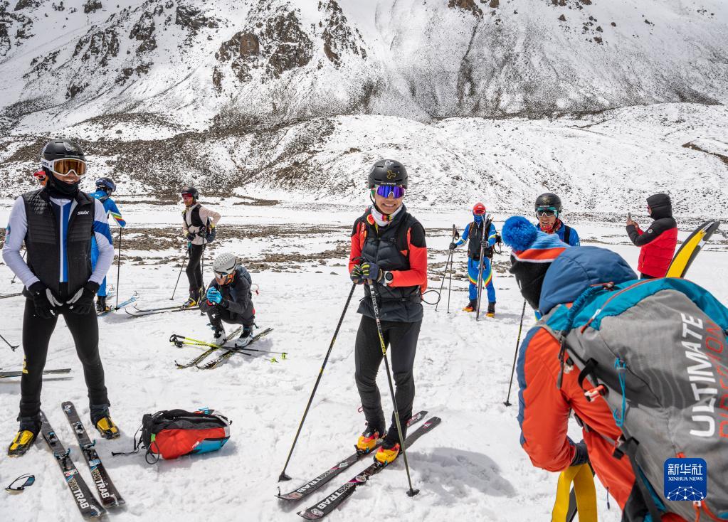 在西藏拉薩市當(dāng)雄縣羊八井鎮(zhèn),玉珍拉姆(左二)和隊友進行滑雪登山訓(xùn)練(5月2日攝)。新華社記者 孫非 攝
