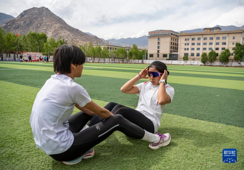 在西藏拉薩市當(dāng)雄縣羊八井鎮(zhèn),玉珍拉姆(中)在訓(xùn)練休息時和隊友聊天(5月2日攝)。新華社記者 孫非 攝