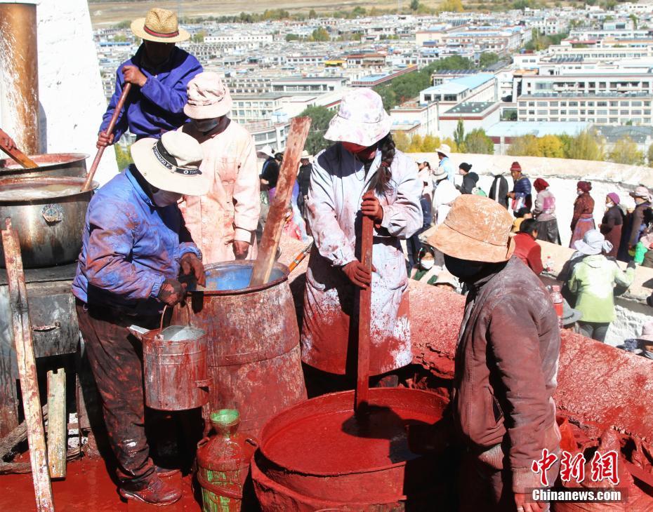 布達(dá)拉宮管理處維修科工作人員熬制粉刷涂料。中新社記者 趙延 攝