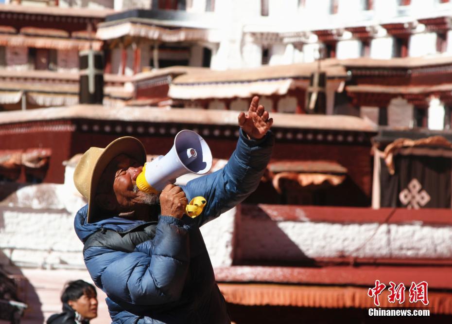 來自美國加利福尼亞州的游客Tim游覽布達(dá)拉宮時,遇到排隊上山粉刷的信眾,豎起大拇指為他們點贊。中新社記者 趙延 攝
