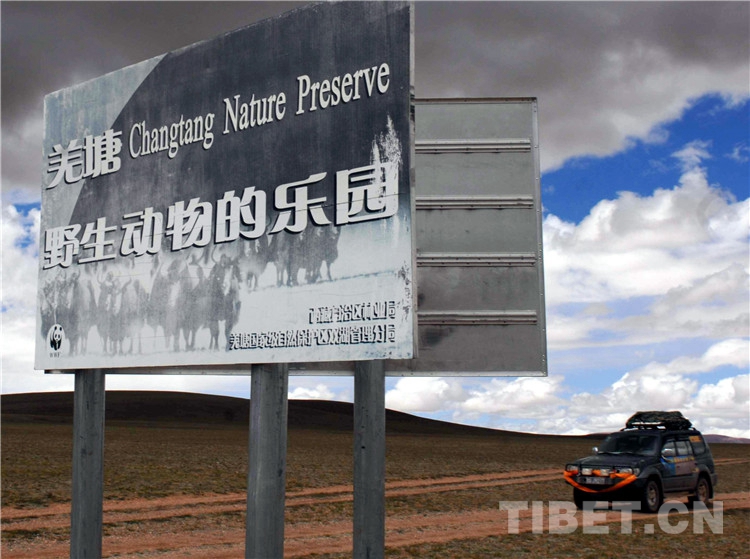 圖為一輛自駕游車(chē)輛通過(guò)羌塘國(guó)家級(jí)自然保護(hù)區(qū)的標(biāo)志牌(2009年) 攝影:唐召明
