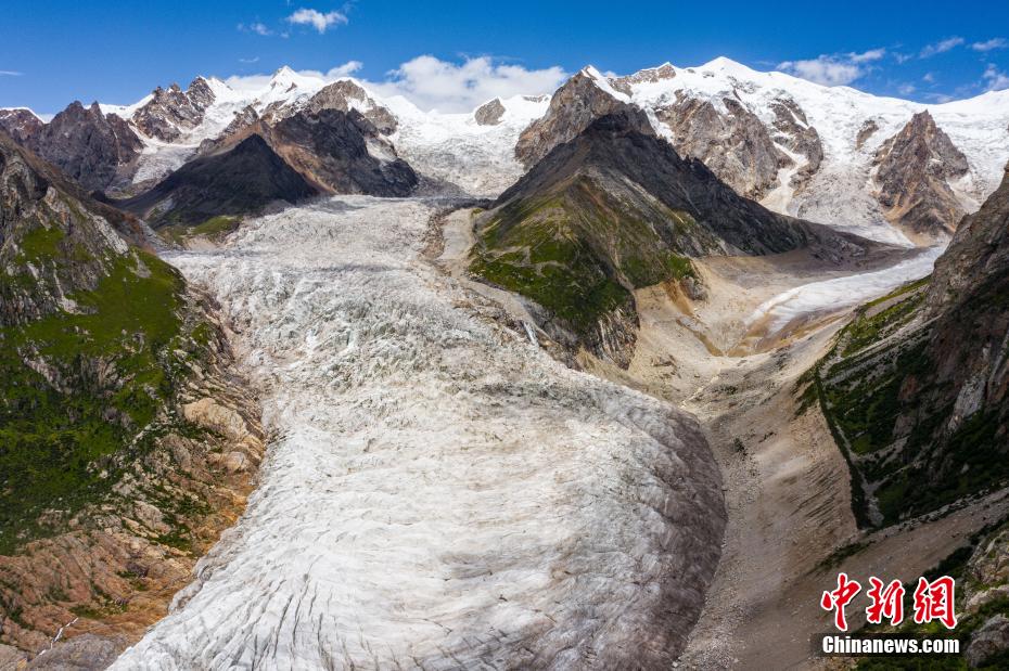 約雄冰川距離巴青縣城約85公里,冰川所在區(qū)域?qū)儆趪壹?jí)濕地保護(hù)區(qū),主要由冰川下游冰緣區(qū)的湖泊水域、河流、沼澤化草甸及流域匯水區(qū)的部分水源林地組成。圖為航拍約雄冰川。 何蓬磊 攝