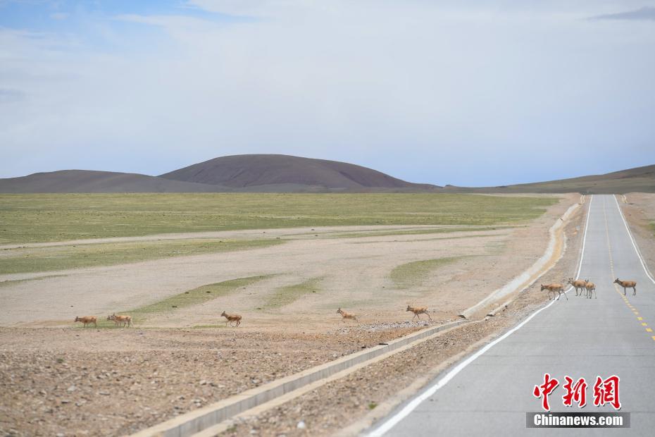 6月20日,藏羚羊群在西藏那曲雙湖縣境內(nèi)穿越公路。羌塘草原位于西藏自治區(qū)北部,平均海拔超過4600米,是目前中國海拔最高、面積最大的自然保護區(qū)。這里是野生動物的樂園,藏羚羊、藏原羚、藏野驢等珍稀野生動物與雪山、草地、藍天、白云,構(gòu)成撼人心魄的壯美畫面。中新社記者 貢嘎來松 攝