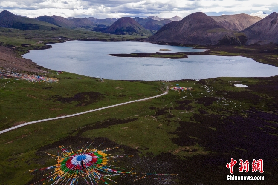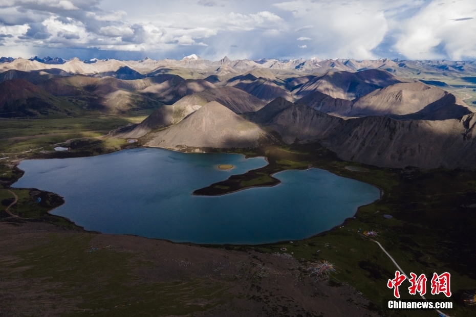 6月23日,思金拉措湖邊高原山脈風(fēng)光。思金拉措位于西藏墨竹工卡縣日多鄉(xiāng),海拔4500多米,周邊群峰簇?fù)恚匦为q如聚寶盤,不少民眾將其稱為西藏的“財(cái)神湖”。(無(wú)人機(jī)照片) 中新社記者 江飛波 攝