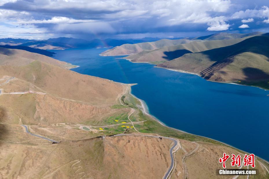 記者途徑羊卓雍錯(cuò)時(shí)恰遇彩虹出現(xiàn),湖面一片翠藍(lán),風(fēng)光絕美。江飛波 攝