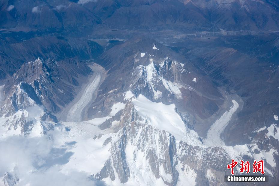 近日,記者從四川成都飛往西藏拉薩的航班上俯瞰青藏高原,一覽高原冰川、湖泊、河流等秀麗風(fēng)光。圖為10月14日,進(jìn)藏航班途徑冰川上方,冰川腳下為兩條冰舌。江飛波 攝