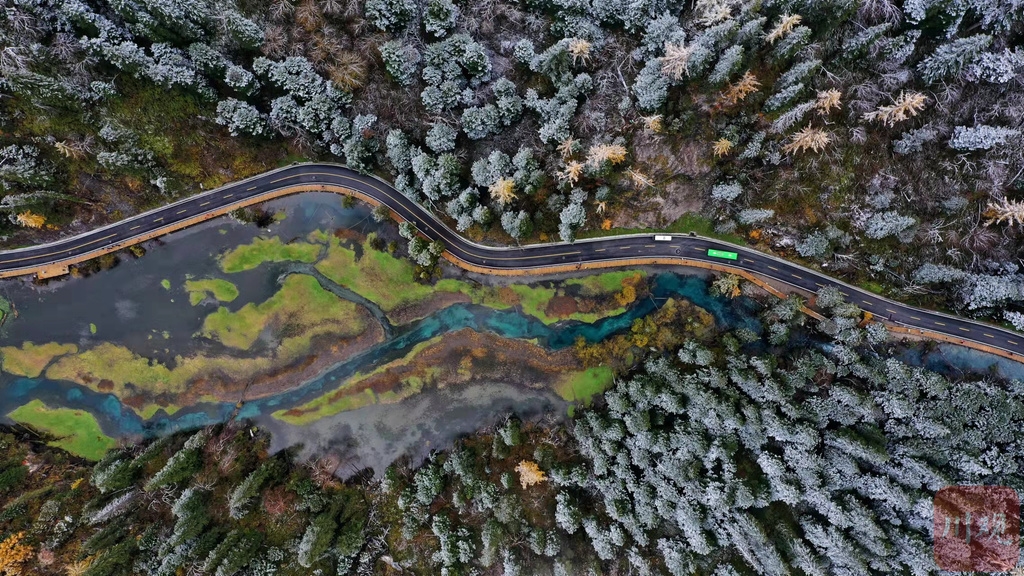 交替時(shí)節(jié),四川各地眼下已融合成了多姿多彩的天然調(diào)色盤,或是彩林錯(cuò)落,或是銀裝素裹,彩林與白雪相遇相擁,半山彩林半山雪的景致讓人無限向往。