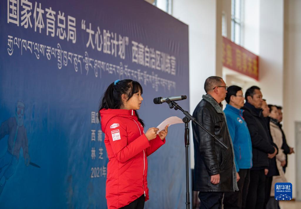 12月30日,西藏自治區(qū)體育局局長(zhǎng)尼瑪次仁在國(guó)家體育總局“大心臟計(jì)劃”西藏自治區(qū)訓(xùn)練營(yíng)開營(yíng)儀式現(xiàn)場(chǎng),向?qū)W員們介紹訓(xùn)練營(yíng)情況。新華社記者 孫非 攝