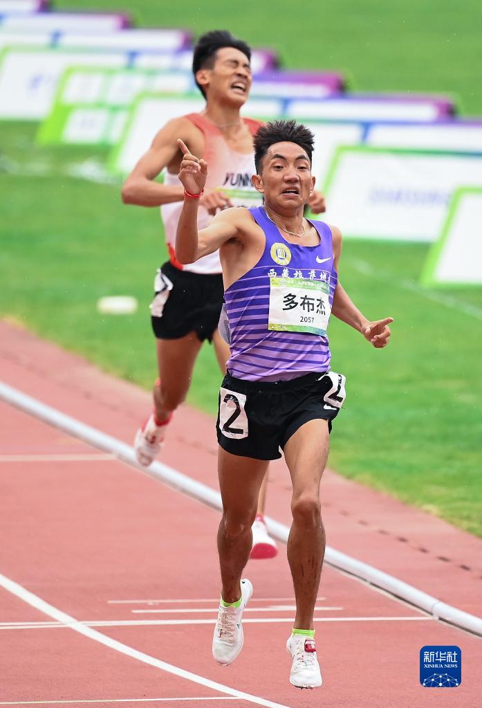 在第十四屆全運(yùn)會(huì)田徑項(xiàng)目男子5000米決賽中,西藏隊(duì)選手多布杰(前)以13分49秒16的成績(jī)奪冠(2021年9月23日攝)。新華社記者 宋彥樺 攝