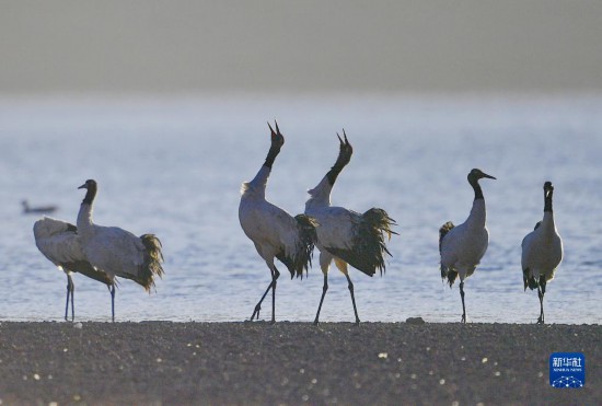 黑頸鶴在拉薩市林周縣農(nóng)田里起舞(1月8日攝)。新華社記者 張汝鋒 攝