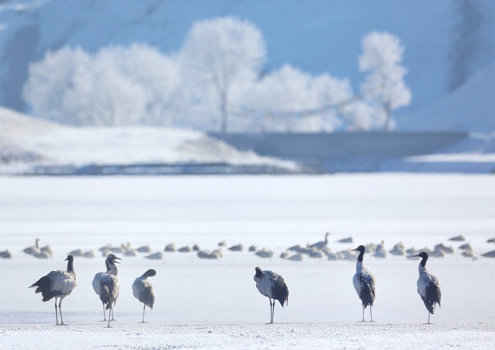 近日,西藏拉薩市林周縣迎來降雪,位于林周縣境內(nèi)的黑頸鶴保護區(qū)變成了粉妝玉砌的世界,黑頸鶴與白皚皚的大雪相互點綴,構(gòu)建出一幅自然和諧的冬日畫卷。