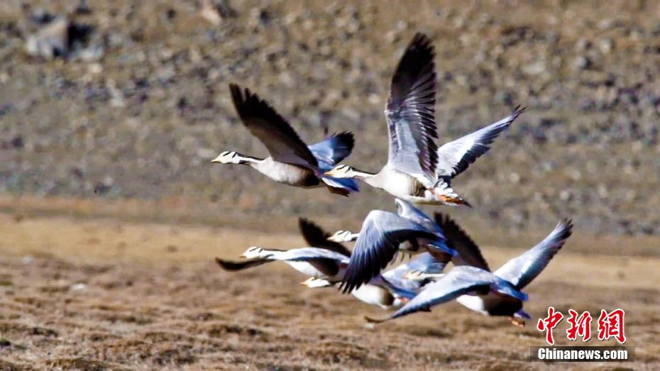 日前,“高原藍寶石”青海湖迎來大批候鳥安營筑巢。圖為飛翔的斑頭雁。 張世偉 攝