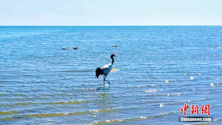 作為中國最大的內陸湖泊,青海湖不僅是維系青藏高原東北部生態(tài)安全的重要水體、控制西部荒漠化向東蔓延的天然屏障,也是中亞、東亞兩條候鳥遷徙路線的交匯點,是中國境內候鳥繁殖數(shù)量最多、種群最為集中的繁殖地。圖為在湖邊散步的黑頸鶴。 張世偉 攝
