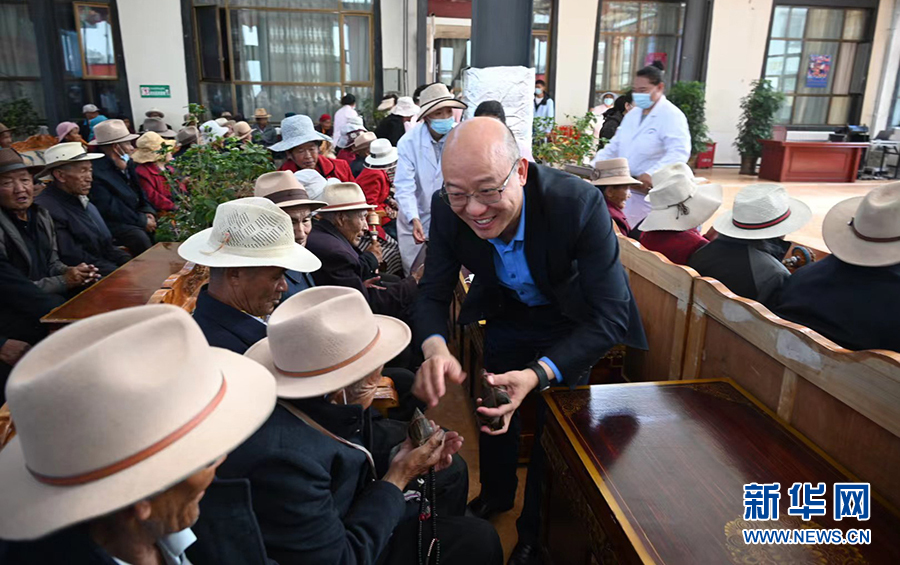 6月3日,在西藏山南市集中供養(yǎng)服務(wù)中心,安徽第七批援藏工作隊隊長汪華東為孤寡老人送上粽子。新華網(wǎng) 王雷 攝